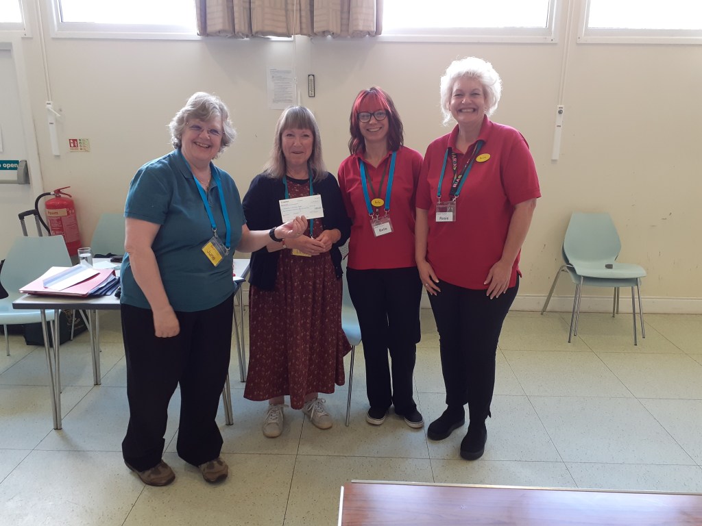 The photograph shows June, the lead of our management team and Lindy, our wonderful singing coordinator, receiving a cheque for £176.90 from Belle and Rosie from St Monica’s. Many thanks to Rosie and Belle for organising the event and to St Monica’s for their generous donation